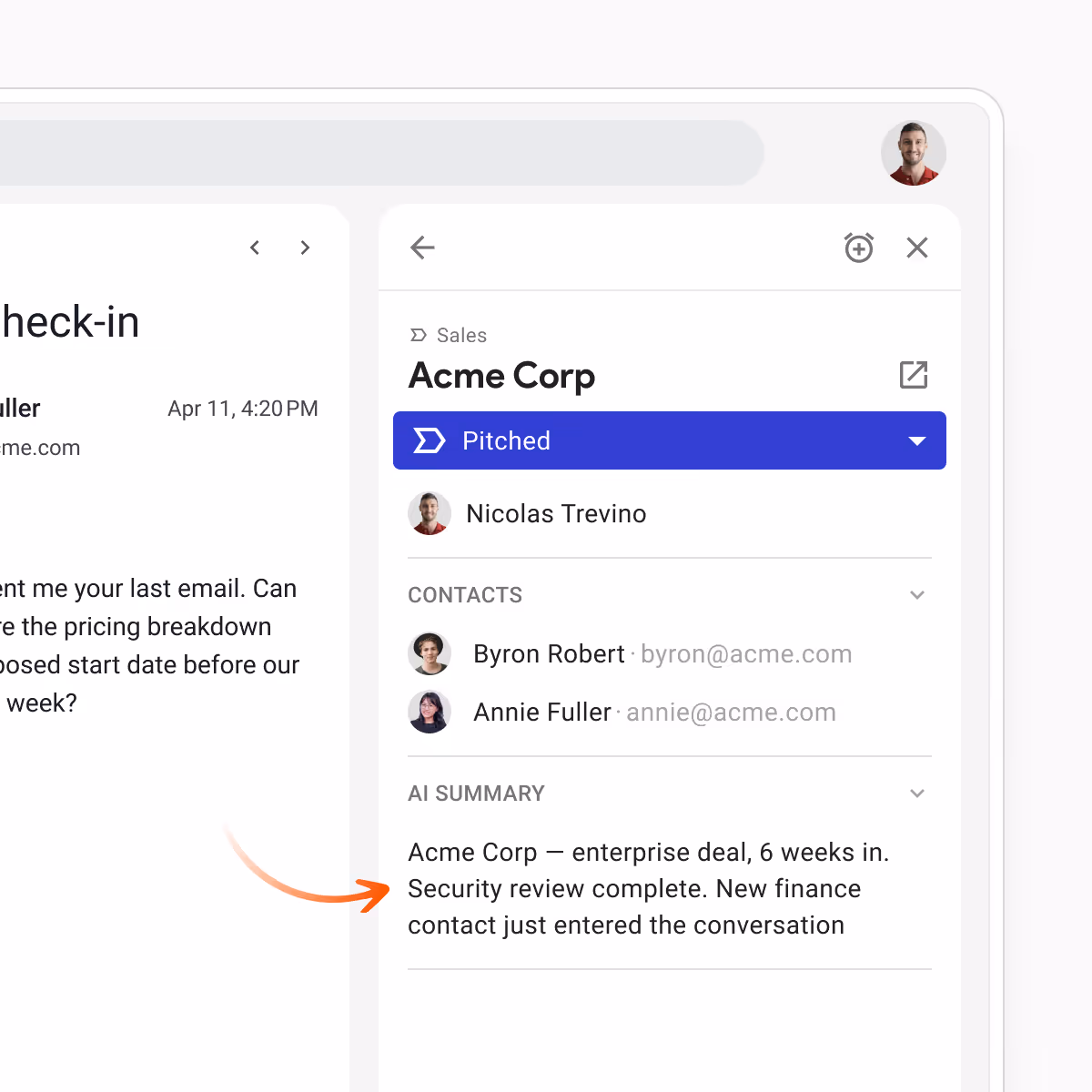AI CRM features for every deal: pull context and update fields without leaving Gmail