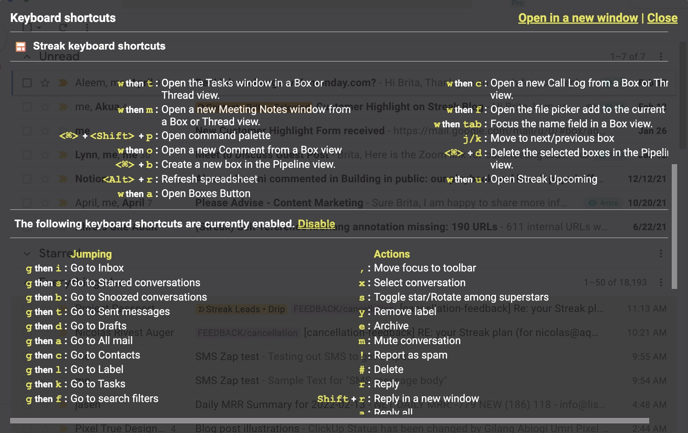 Streak has keyboard shortcuts for nearly all of the major tasks you do in your boxes, email threads, and pipelines, and we’ve even incorporated the keys into Gmail’s keyboard help system. Just type a “?” when you’re in Gmail to find a list of available keyboard shortcuts.