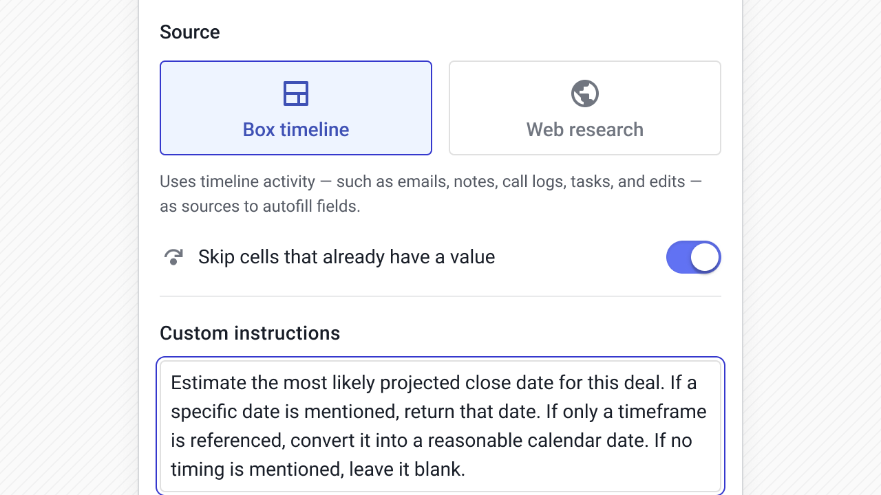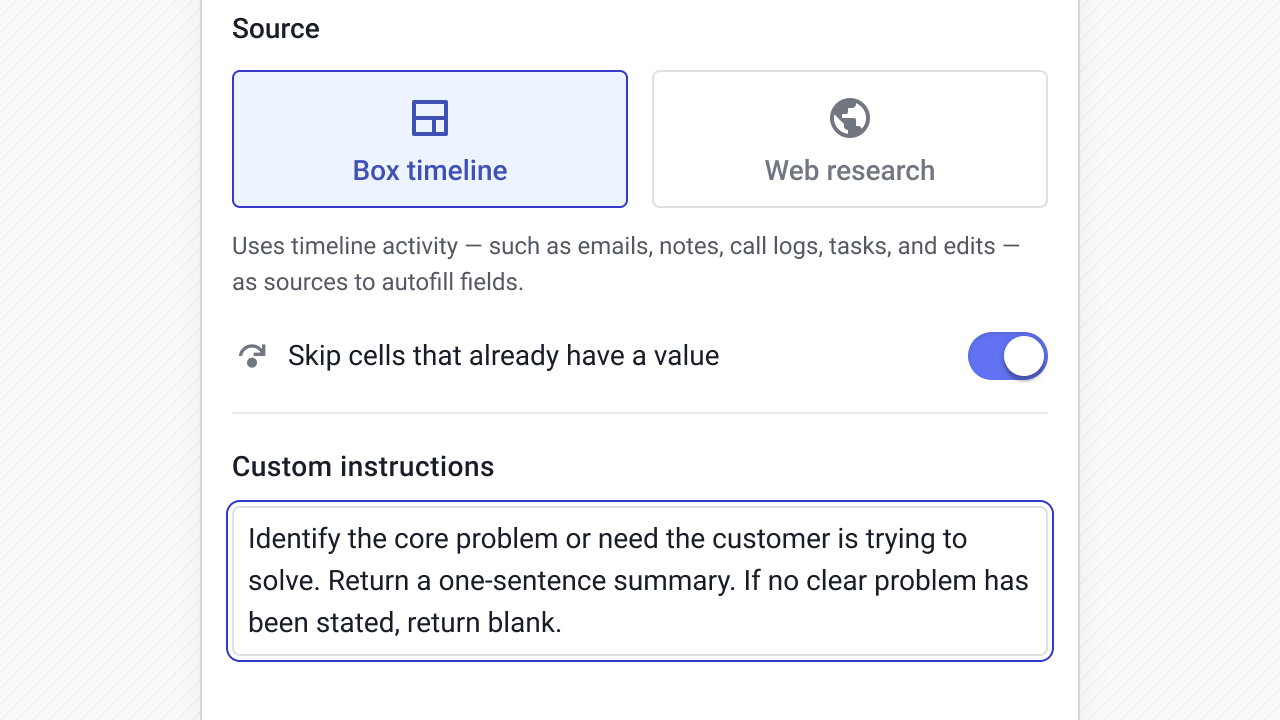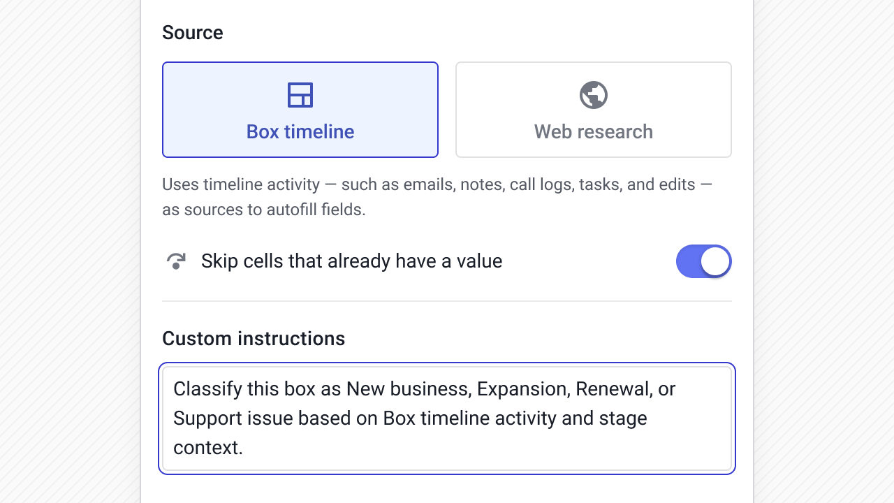 Instead of asking reps to constantly update fields, AI can read the Box timeline or pull from the web and write structured values directly into your CRM fields.