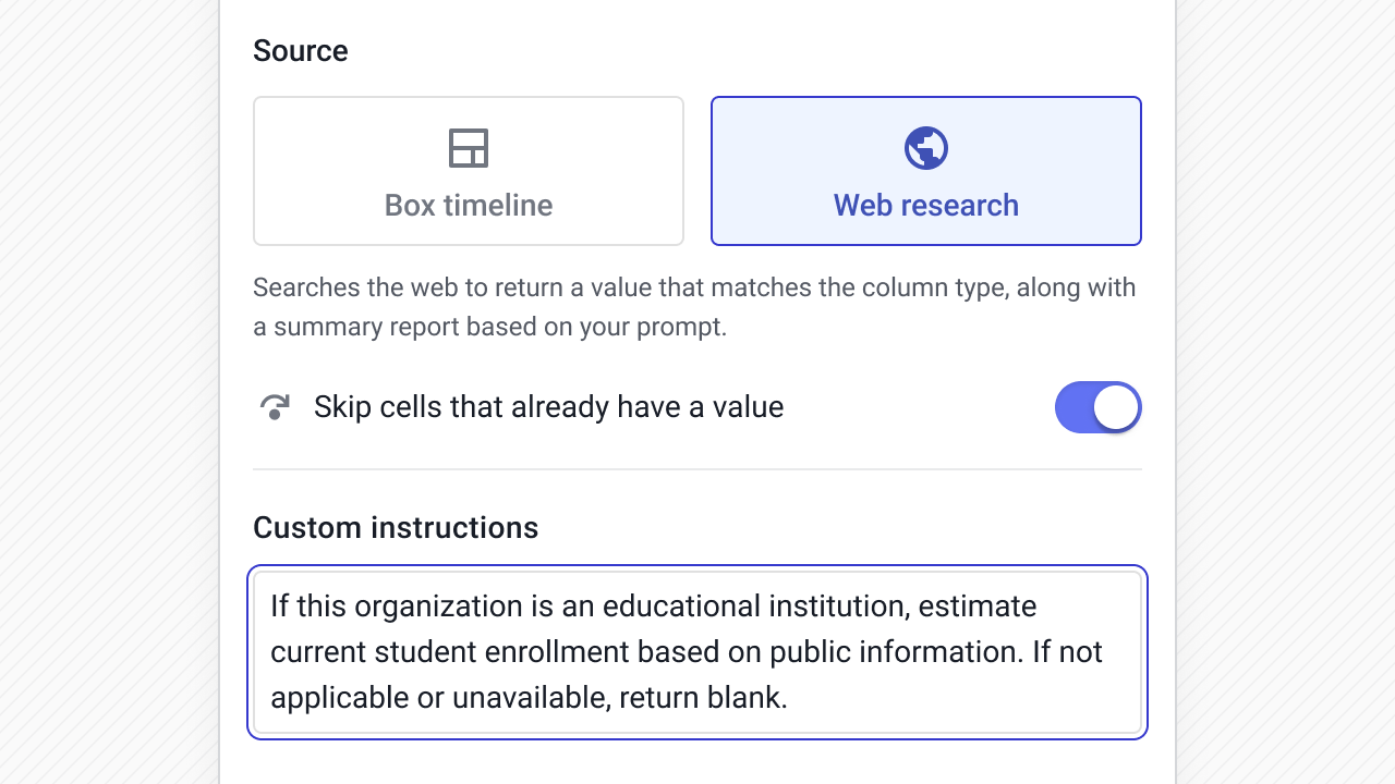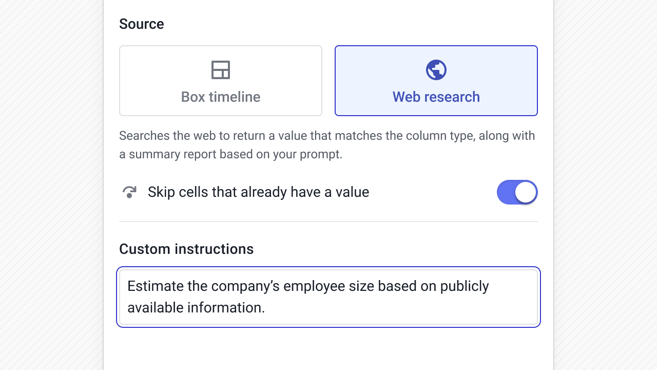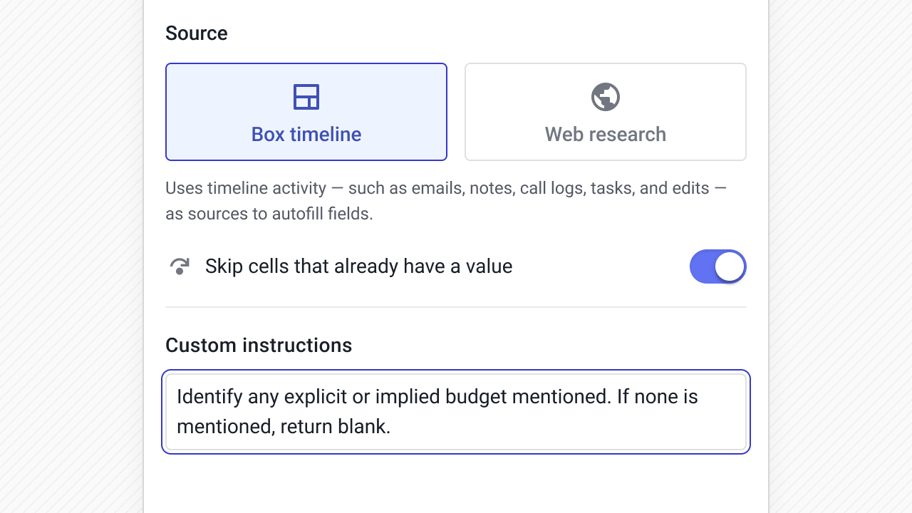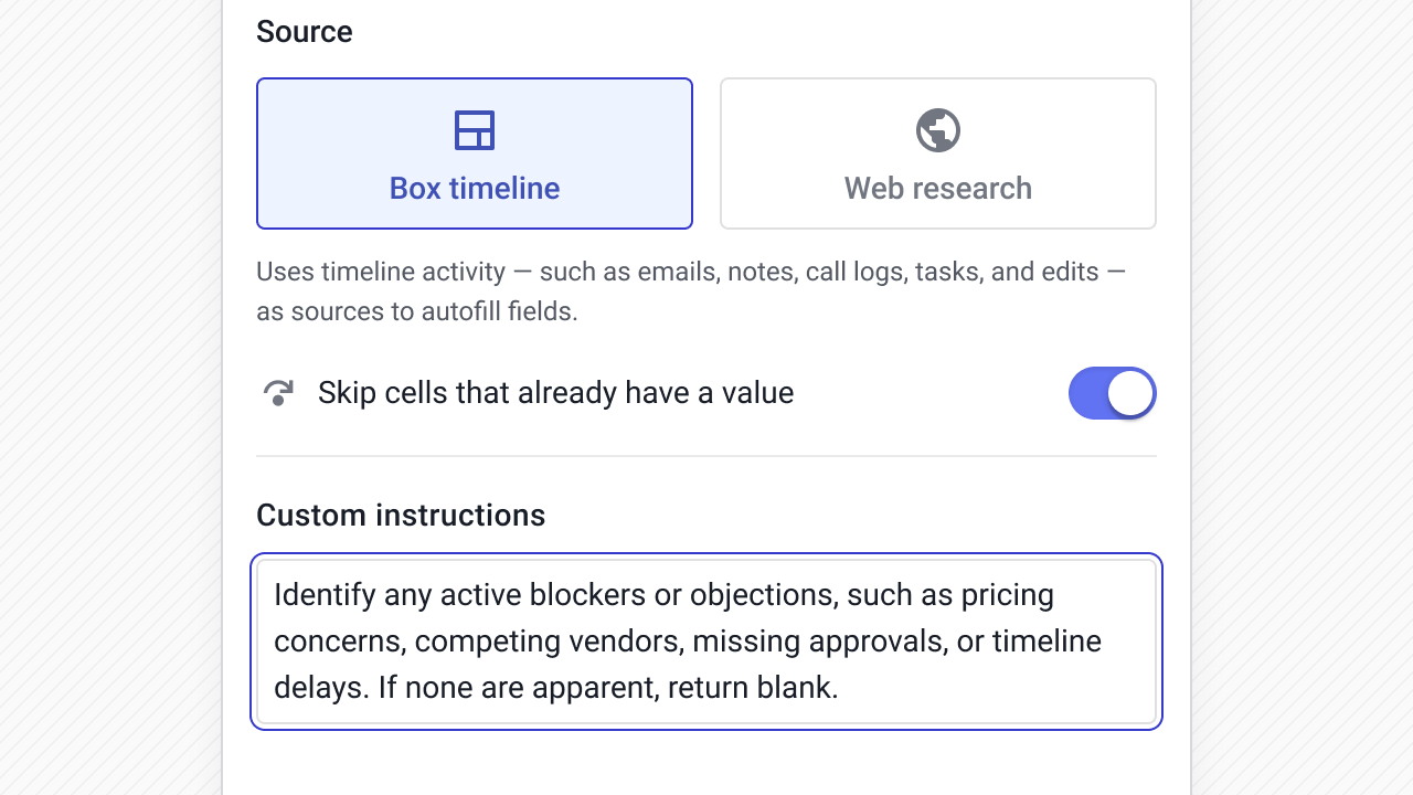 Instead of asking reps to constantly update fields, AI can read the Box timeline or pull from the web and write structured values directly into your CRM fields.