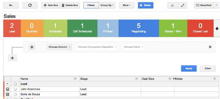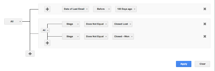 While I don’t have anybody in the Closed-Won and Closed Lost stages right now I might, but I still don’t want them to show up for contacting. So what I’ll do for them is add some extra conditions to my filter so the boxes in those two stages get filtered out as well.