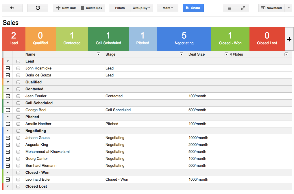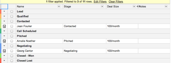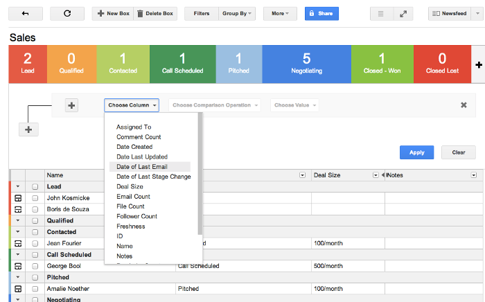 The first thing that I want to do is see which of these deals I haven’t exchanged an email with for a while. To do that I’ll create a filter using the new filter interface.